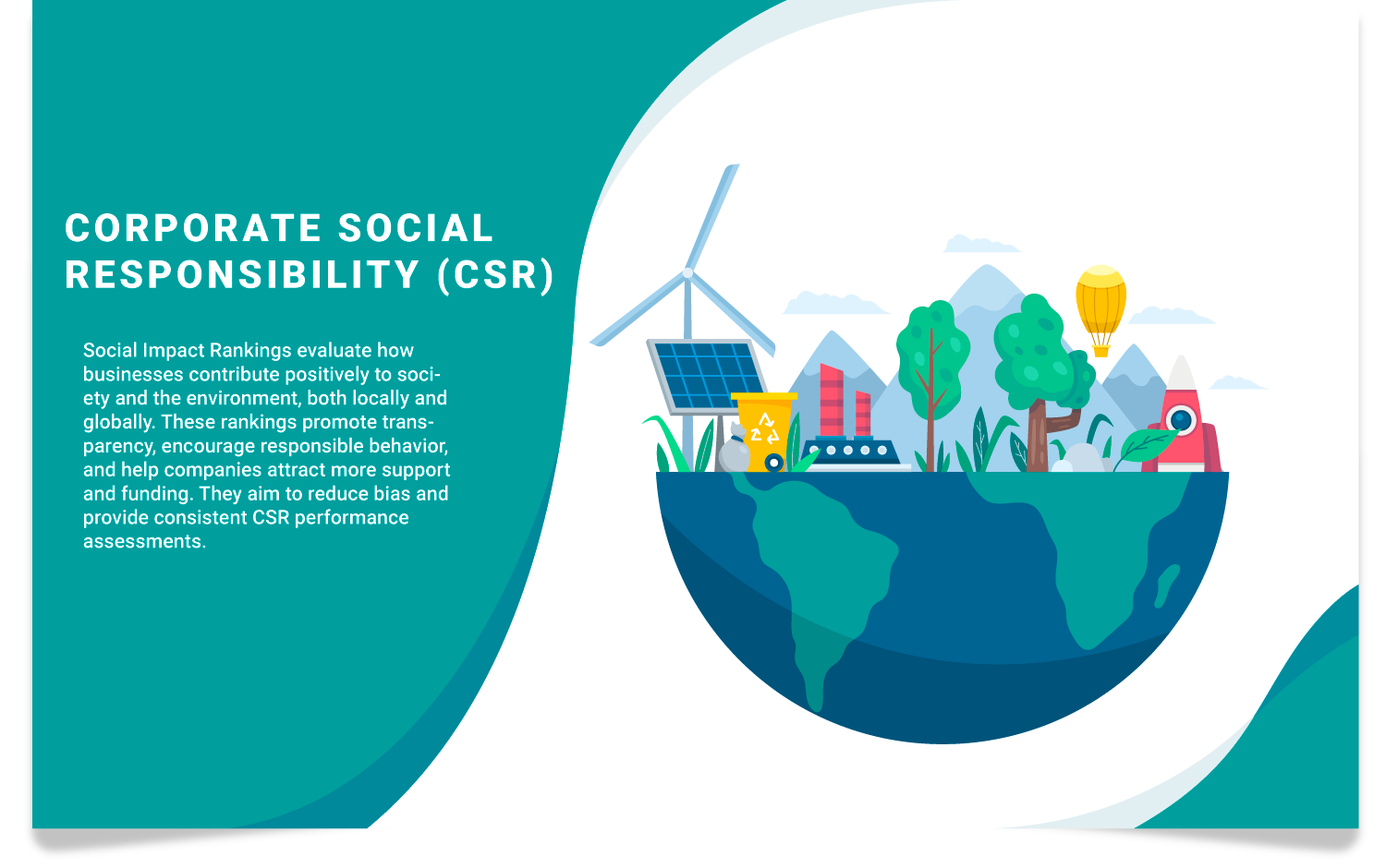 The Impact of the Social Impact Rankings and Why Rankings Matter. Corporate Social Responsibility (CSR) and Corporate Responsibility (CR) are increasingly top drivers of stakeholder support. The best practices from the top companies with the highest reputation scores are what makes a difference not only to the community but to the business as a whole. The objective is to provide consistent ratings of Corporate Social Responsibility (CSR) performance for as broad a range of companies as possible. Our ranking system attempts to remove most of the above sources of bias and inconsistency. the rankings are focussed on understanding how the business sector is making a positive contribution to society and the environment in the Kingdom and across the world. The ranking supports behaviour change among companies in the Kingdom and identifies whether their contribution is making a difference. This will allow businesses with highly specific remits to appear in the rankings and hopefully attract more business and more funding as a result.
